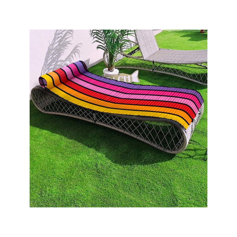 Gesteppte, abgefütterte Strandmatte mit integrierter Kopfrolle in pepigen Farbkombinationen mit super Komfort an Sand- oder Kiesstränden. Mittels Tragegurt lässt sie sich bequem transportieren.