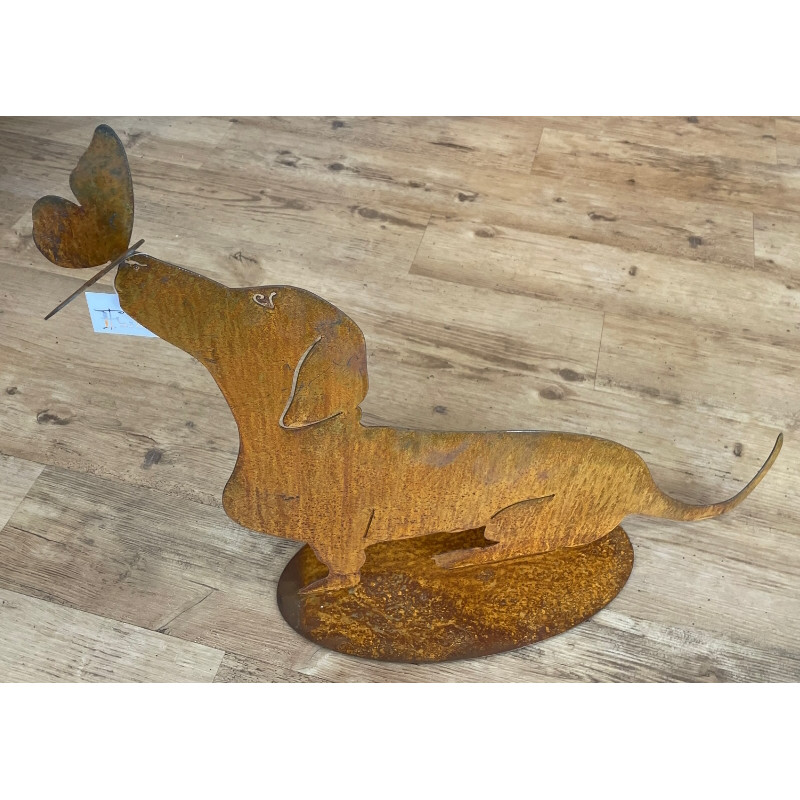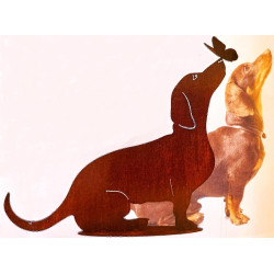 Sitzende Dackeldame Vroni mit einem Schmetterling auf der Nase. Die entzückende Dame begleitet Sie sicher lange.