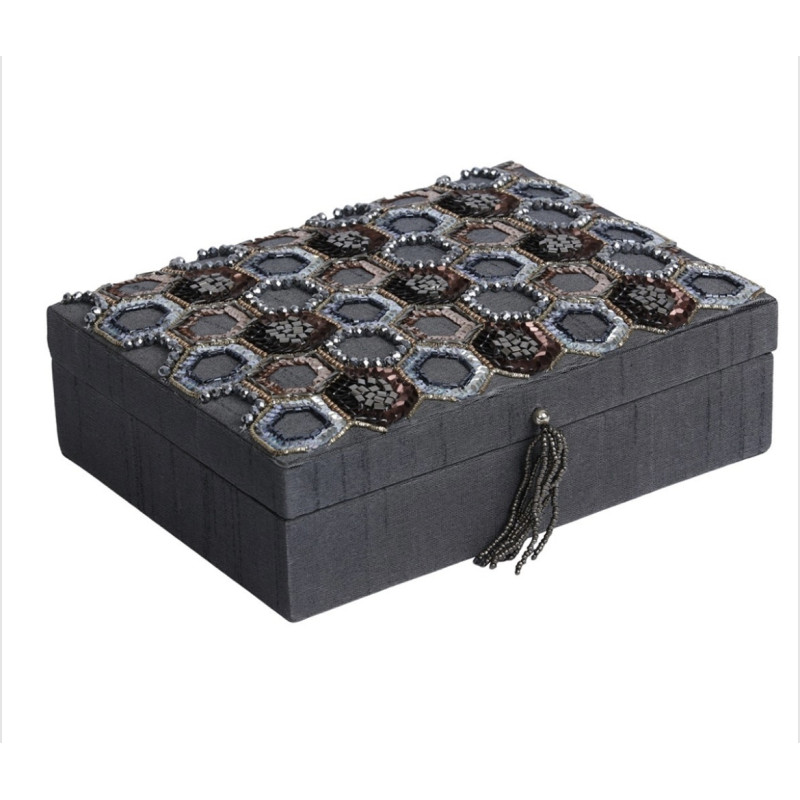 Sehr dekorative Schmuckschatulle, die überall ihre Blicke auf sich zieht und kleine Kostbarkeiten geschützt aufbewahrt. Dabei sieht sie selbst aus wie ein Schmuckstück. Der Deckel ist aufwändig mit Glasperlen von Hand bestickt.