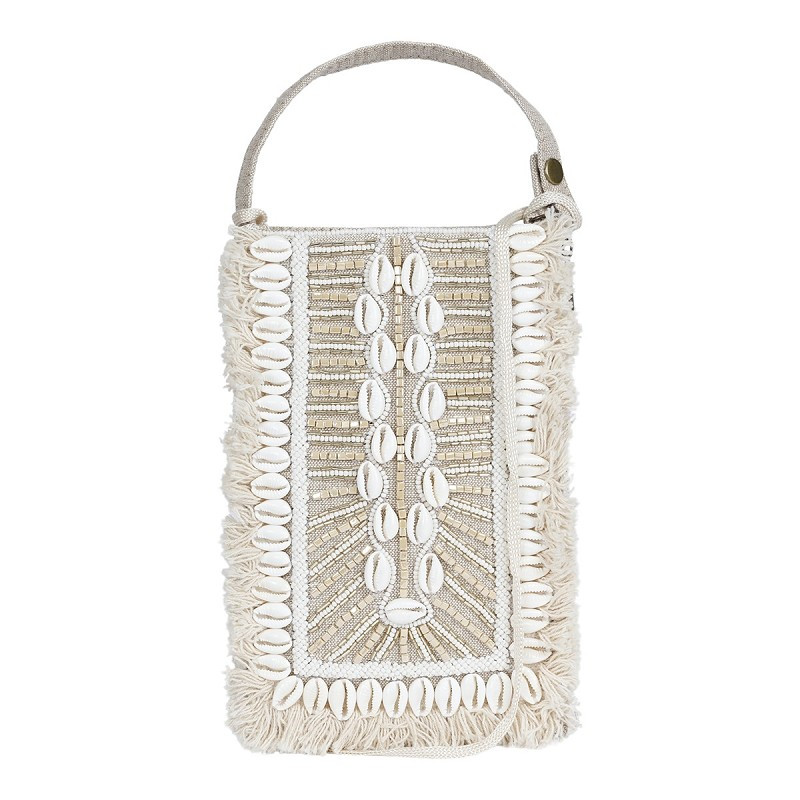 Die Tasche ist mit Perlen und kleinen Muscheln in creme handbestickt und besitzt eine Handschlaufe als auch einen feinen Riemen zum Tragen.