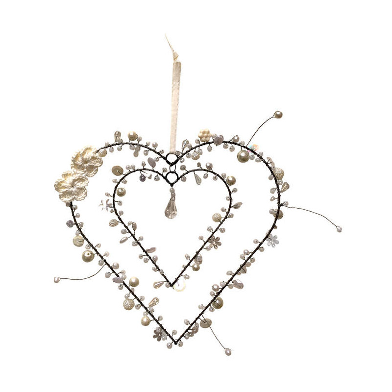 Liebevoll handgearbeitetes Draht-Herz verziert mit vielen verschiedenen Perlen zur farbenfrohen Dekoration von Türe, Fenster oder Wand.