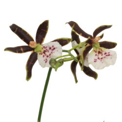 Die außergewöhnliche Orchidee mit zwei Blütenstiele in besonderer Farbkomposition, viel Laub und Ballen ist ein sehr dekorativer Blickfang.