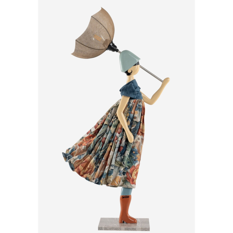 Jede Lampe ist eine kleine Persönlichkeit. Die Kollektion ist inspiriert nach dem Nordwestwind, einem wichtigen Element von Thessaloniki, der sogar der den kleinen Ladies Bewegung verleiht. Der Lampenkörper aus Holz ist hochwertig verarbeitet und wird in Handarbeit von einer griechischen Kunstmanufaktur hergestellt und handbemalt. Der Rock bzw. das Kleid ist aus versteiften Textilien.