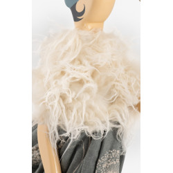 Zenias extravagantes Outfit ist in einem elegantem Salbei mit Creme gehalten. Pusteblumen zieren den Rock und ebenso fedrig ist ihr Pullover.