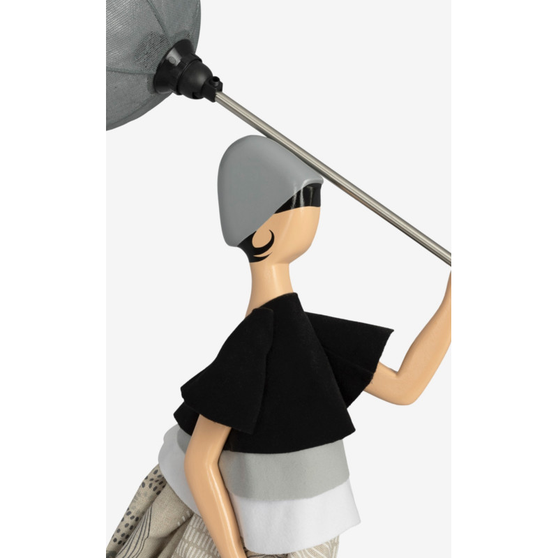 Jede Lampe ist eine kleine Persönlichkeit. Die Kollektion ist inspiriert nach dem Nordwestwind, einem wichtigen Element von Thessaloniki, der sogar der den kleinen Ladies Bewegung verleiht. Der Lampenkörper aus Holz ist hochwertig verarbeitet und wird in Handarbeit von einer griechischen Kunstmanufaktur hergestellt und handbemalt. Der Rock bzw. das Kleid ist aus versteiften Textilien