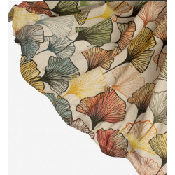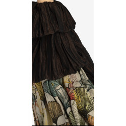 Artemisia trägt zu ihrer eleganten schokobraunen Bluse einen Rock mit farbenfrohen Ginkoblättern und einen gelben filigranen Schirm.