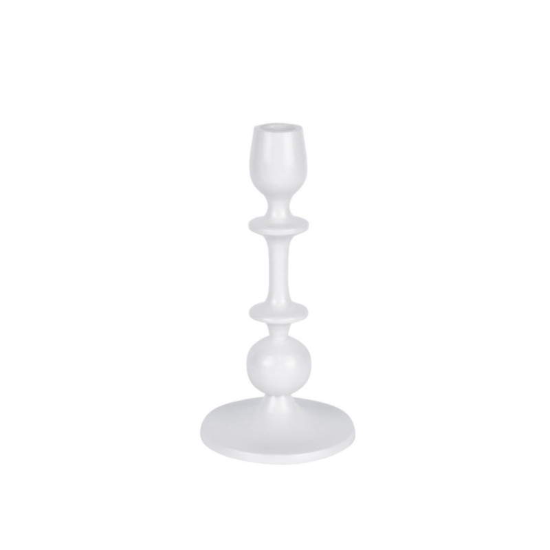 Modern gestalteter Kerzenhalter in hochglanz-weiß lackiertem Metall.