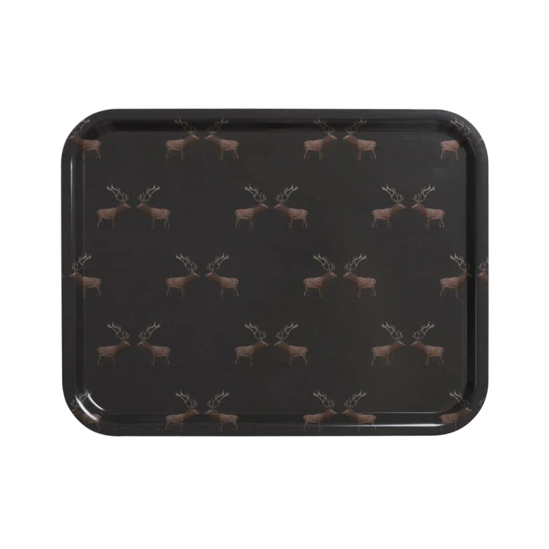 Prächtige Hirschen wiederholen sich auf schwarzem Hintergrund auf diesem prächtigen, handgefertigten bedruckten Tablett.