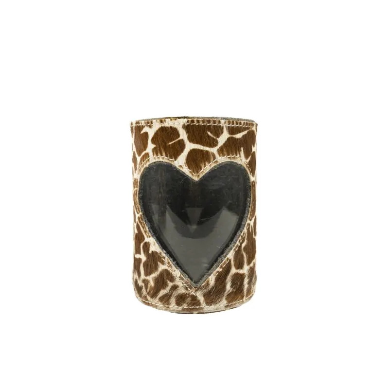 Dekoratives Windlicht/Teelichthalter aus mit Giraffenmuster bedrucktem Kuhfell und Herzausschnitt. Das Windlicht ist mit anthrazitfarbenem Filz und einem Glaseinsatz ausgekleidet.
