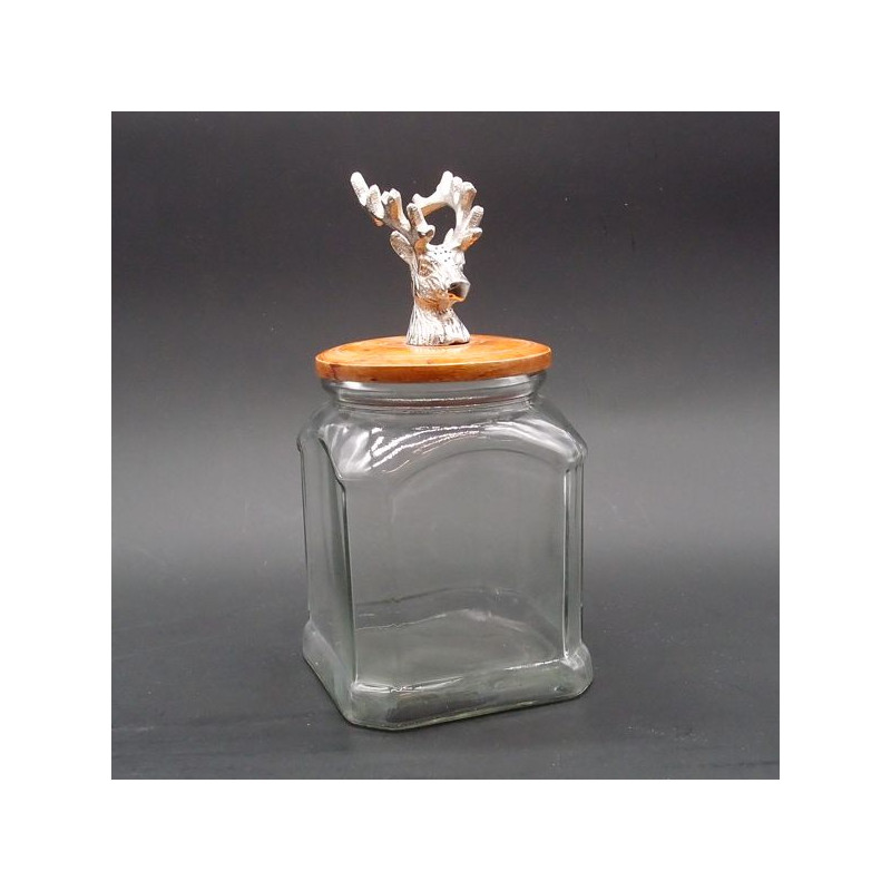 Ein optisches Schmuckstück ist die Glasdose mit dem Holzdeckel und den aufgesetzten Hirschkopf in Alu.