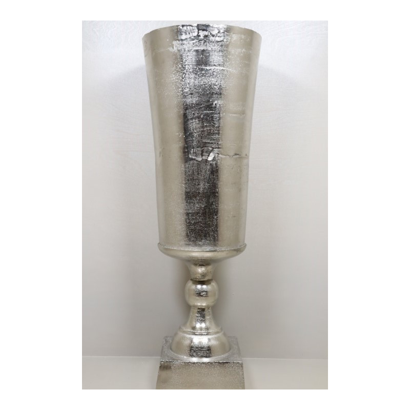 Die große präsentative Pokalvase in edlem silbernem massiven Aluminiumguss mit einem Finish in Antiksilber verleiht jedem Raum einen stilvollen Hingucker.