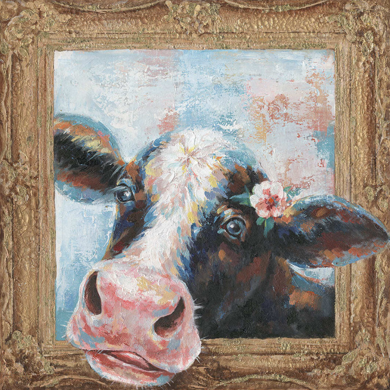 Witzig und frech blickt die Kuh durch den goldenen Rahmen. Das dekorative Ölbild ist handgefertigt und bildet einen fröhlichen Blickfang im glamourösen Alpin-Chic.