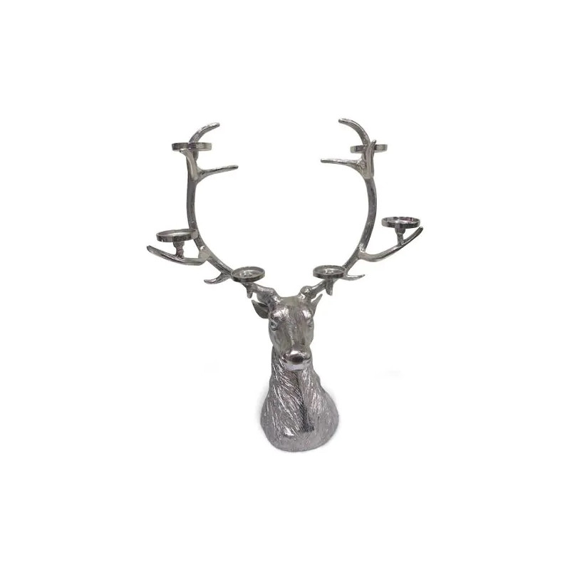 Der prachtvolle Kerzenleuchter aus massivem Aluguss vernickelt mit Silber-Finish und detaillierter Prägung in Form eines Hirschkopfes ist das Highlight für den alpinen Landhausstyle. Im Geweih trägt er 6 Kerzenhalter mit Tropfrand für Stabkerzen.