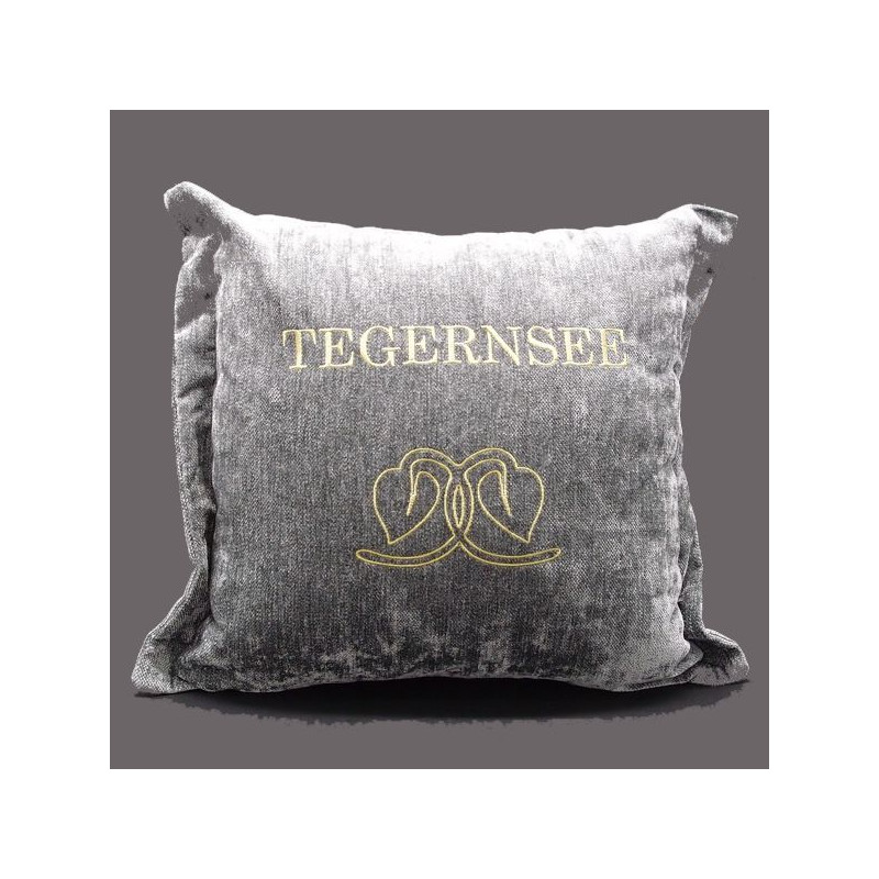 Feines Chenillesamt Zierkissen bestickt mit "Seelaub" und Schriftzug "Tergernsee". Nicht nur ein dekoratives Accessoire für Bergfreunde, auch der feine Stoff mit leichtem Glanz bietet eine weiche anschmiegsame Haptik. Die Wertigkeit wird mit dem Stehsaum unterstrichen.
