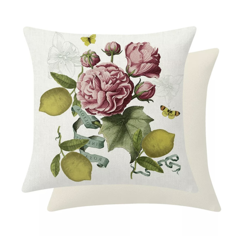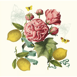 Die Vorderseite ziert das elegante mediterrane Zitronen-Rosen-Design, die Rückseite ist uni naturfarben.