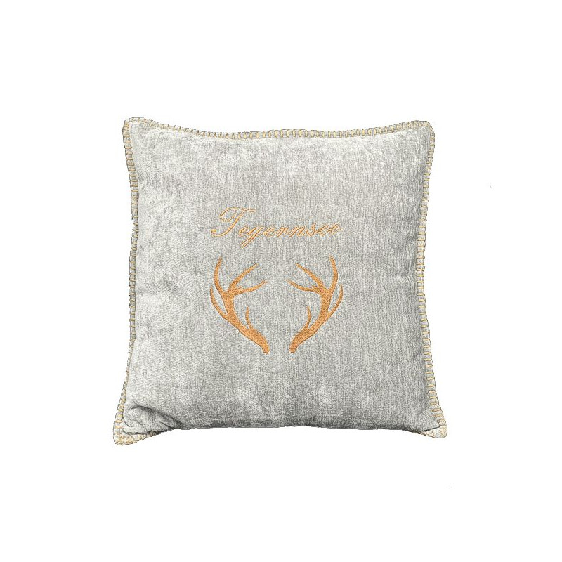 Feines Chenillesamt Zierkissen bestickt mit "Geweih" und Schriftzug "Tergernsee". Nicht nur ein dekoratives Accessoire für Bergfreunde, auch der feine Stoff mit leichtem Glanz bietet eine weiche anschmiegsame Haptik. Die Wertigkeit wird mit dem Stehsaum unterstrichen.