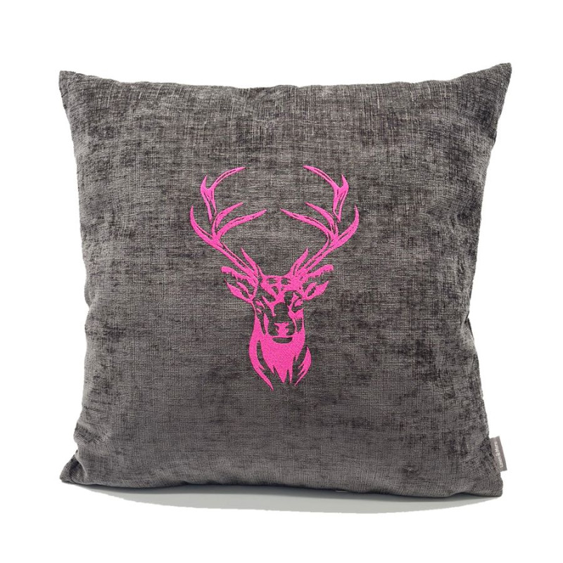 Feines Chenillesamt Zierkissen bestickt mit Motiv "Hirschkopf". Ein Hingucker und dekoratives Accessoire nicht nur für Bergfreunde, auch der feine Stoff mit leichtem Glanz bietet eine weiche anschmiegsame Haptik.