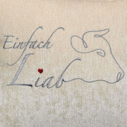 Feines Chenillesamt Zierkissen bestickt mit stilisiertem Schriftzug der in einen Kuhkopf übergeht. Nicht nur ein liebevoller Hingucker für Kuhfreunde, auch der feine Stoff mit leichtem Glanz bietet eine weiche anschmiegsame Haptik. Die Wertigkeit wird mit dem Stehsaum unterstrichen.